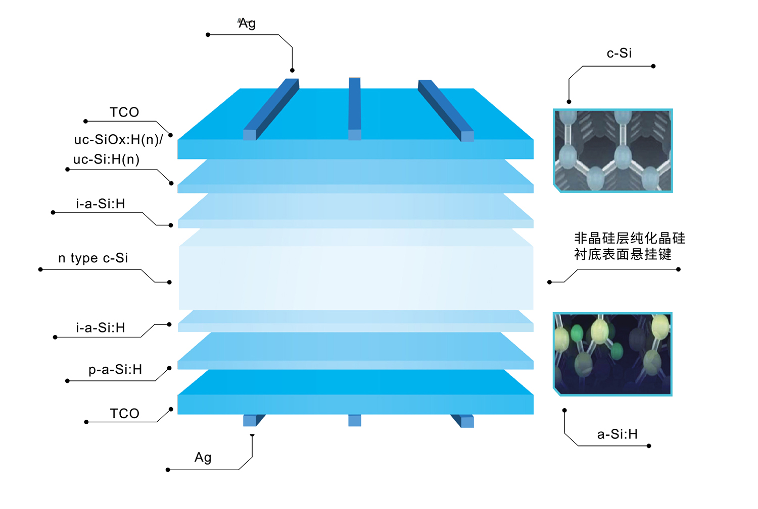 异质结电池全称为本征薄膜异质结电池(Heterojunction with Intrinsic Thin-layer),英文简称HJT,是一种N型双面电池,以N型单晶硅为基底,在前后表面分别沉积不同特性的硅基薄膜叠层和透明导电薄膜。