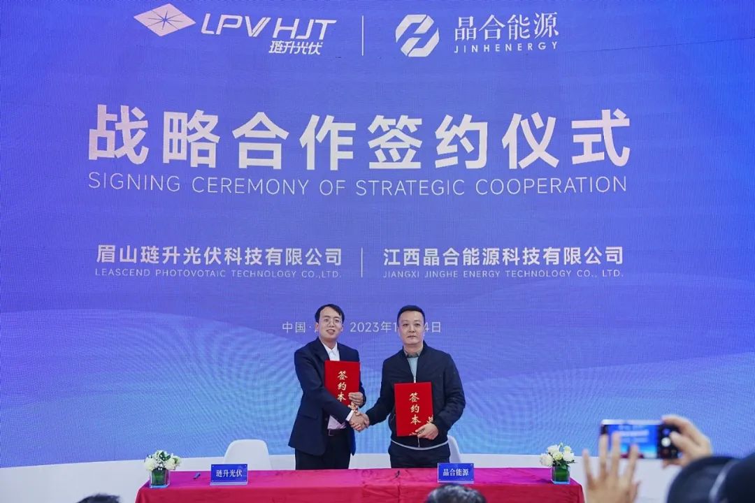 琏升光伏与江西晶合能源科技有限公司签约战略合作协议。琏升光伏总经理唐旋、晶合能源副总经理张军上台签约。晶合能源致力于太阳能电池与光伏组件的生产研发,此次签约,将为双方发展带来新机会,新前景。